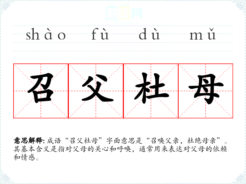 成语“召父杜母”字面意思是“召唤父亲,杜绝母亲”。其基本含义是指对父母的关心和呼唤,通常用来表达对父母的依赖和情感。