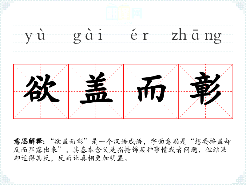 “欲盖而彰”是一个汉语成语,字面意思是“想要掩盖却反而显露出来”。其基本含义是指掩饰某种事情或者问题,但结果却适得其反,反而让真相更加明显。