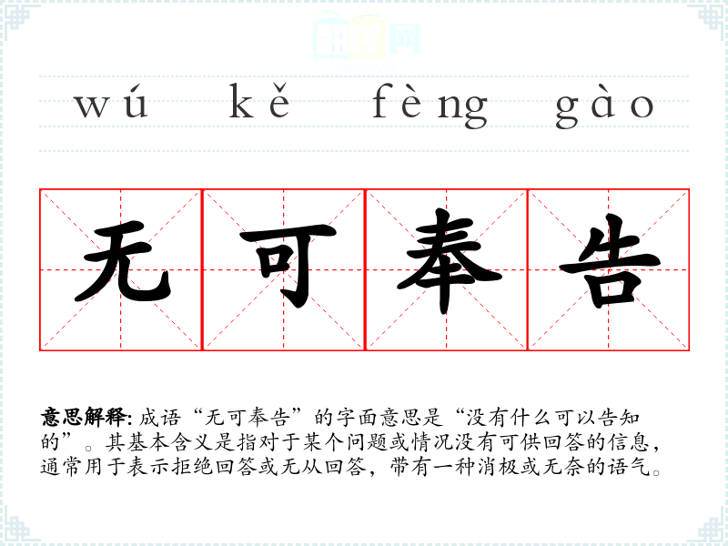 成语“无可奉告”的字面意思是“没有什么可以告知的”。其基本含义是指对于某个问题或情况没有可供回答的信息,通常用于表示拒绝回答或无从回答,带有一种消极或无奈的语气。