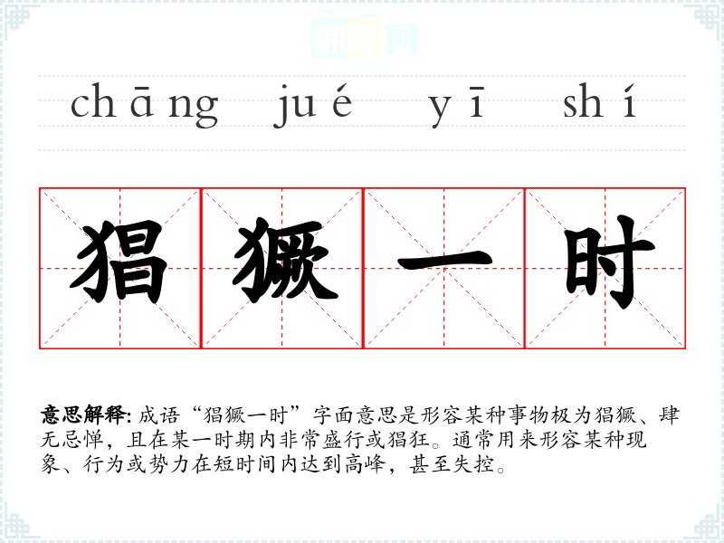 成语“猖獗一时”字面意思是形容某种事物极为猖獗、肆无忌惮,且在某一时期内非常盛行或猖狂。通常用来形容某种现象、行为或势力在短时间内达到高峰,甚至失控。
