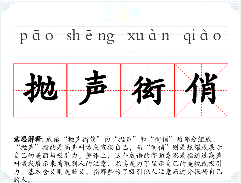成语“抛声衒俏”由“抛声”和“衒俏”两部分组成。“抛声”指的是高声叫喊或宣扬自己,而“衒俏”则是炫耀或展示自己的美丽与吸引力。整体上,这个成语的字面意思是指通过高声叫喊或展示来博取别人的注意,尤其是为了显示自己的美貌或吸引力。基本含义则是贬义,指那些为了吸引他人注意而过分张扬自己的人。