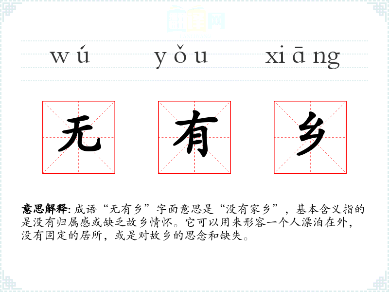 成语“无有乡”字面意思是“没有家乡”,基本含义指的是没有归属感或缺乏故乡情怀。它可以用来形容一个人漂泊在外,没有固定的居所,或是对故乡的思念和缺失。