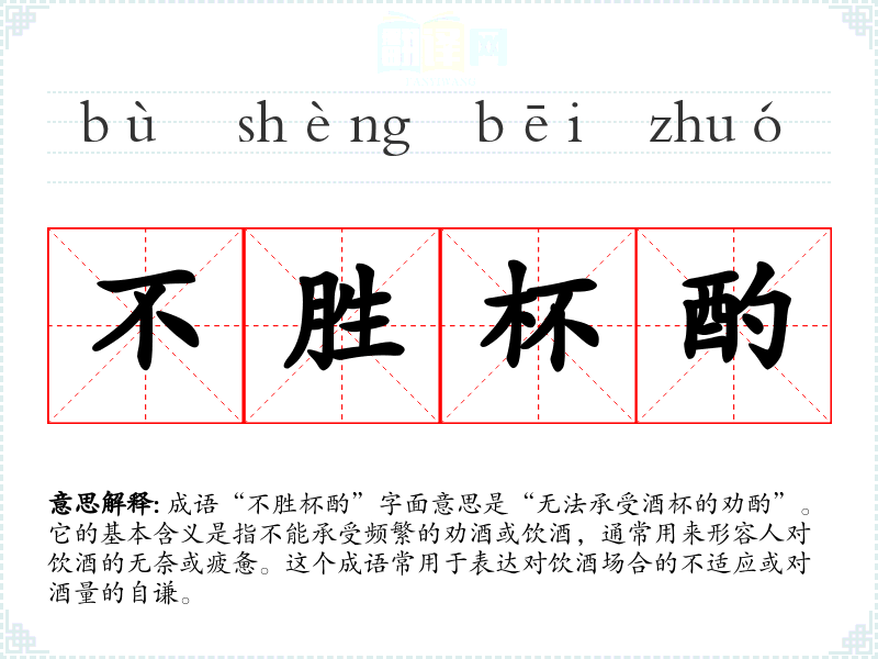 成语“不胜杯酌”字面意思是“无法承受酒杯的劝酌”。它的基本含义是指不能承受频繁的劝酒或饮酒,通常用来形容人对饮酒的无奈或疲惫。这个成语常用于表达对饮酒场合的不适应或对酒量的自谦。