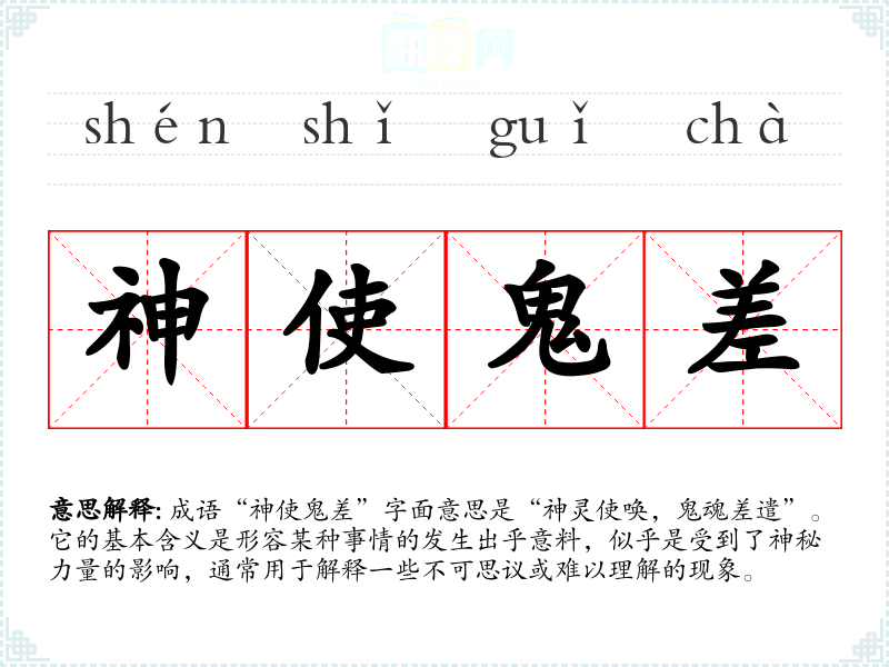 成语“神使鬼差”字面意思是“神灵使唤,鬼魂差遣”。它的基本含义是形容某种事情的发生出乎意料,似乎是受到了神秘力量的影响,通常用于解释一些不可思议或难以理解的现象。