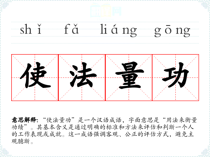 “使法量功”是一个汉语成语,字面意思是“用法来衡量功绩”。其基本含义是通过明确的标准和方法来评估和判断一个人的工作表现或成就。这一成语强调客观、公正的评估方式,避免主观臆断。
