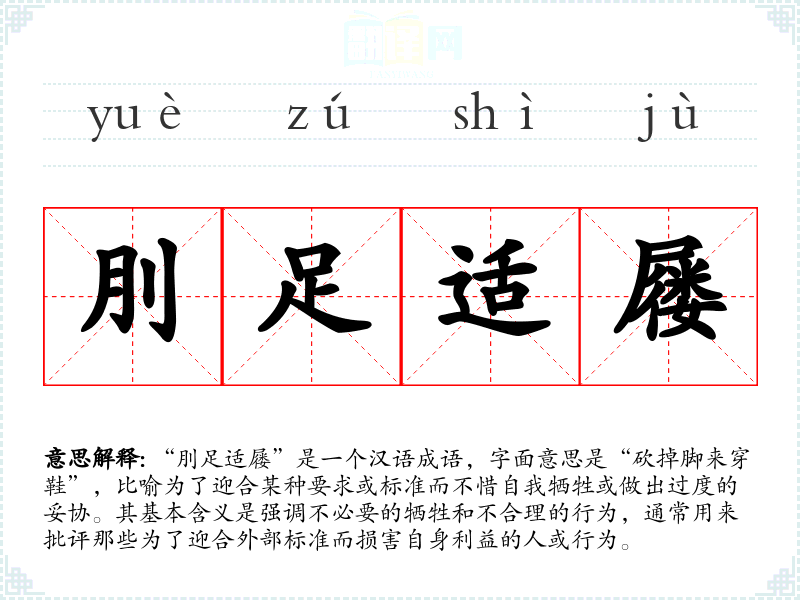 | 刖足适屦 | 刖:截断;屦:鞋。鞋小脚大,就把脚削去一块来凑和鞋的大小。比喻不合理的牵就凑合或不顾具体条件,生搬硬套 |