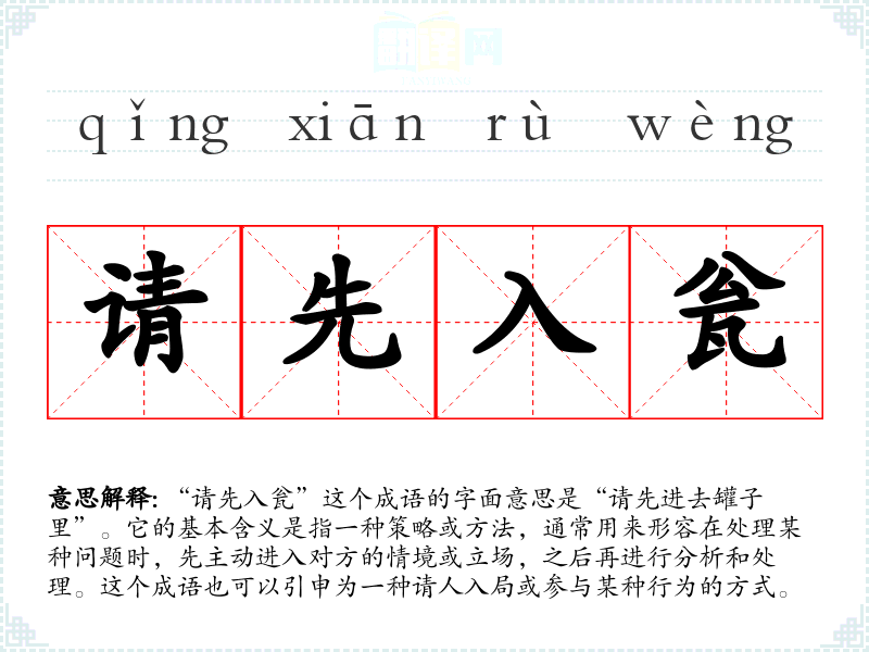 “请先入瓮”这个成语的字面意思是“请先进去罐子里”。它的基本含义是指一种策略或方法,通常用来形容在处理某种问题时,先主动进入对方的情境或立场,之后再进行分析和处理。这个成语也可以引申为一种请人入局或参与某种行为的方式。