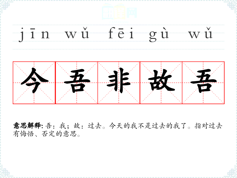 | 今吾非故吾 | 吾:我;故:过去。今天的我不是过去的我了。指对过去有悔悟、否定的意思。 |