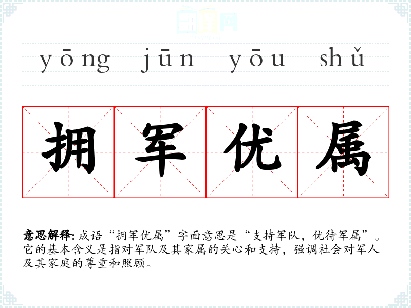 成语“拥军优属”字面意思是“支持军队,优待军属”。它的基本含义是指对军队及其家属的关心和支持,强调社会对军人及其家庭的尊重和照顾。