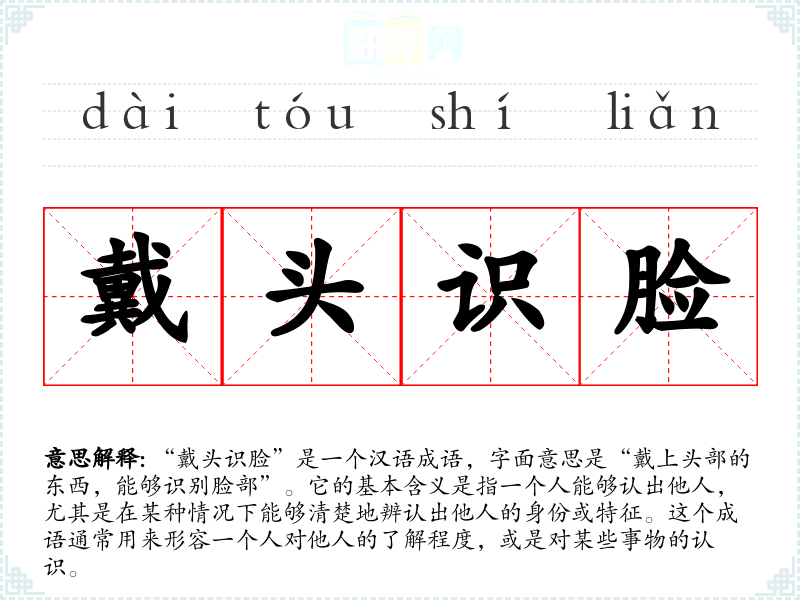 “戴头识脸”是一个汉语成语,字面意思是“戴上头部的东西,能够识别脸部”。它的基本含义是指一个人能够认出他人,尤其是在某种情况下能够清楚地辨认出他人的身份或特征。这个成语通常用来形容一个人对他人的了解程度,或是对某些事物的认识。