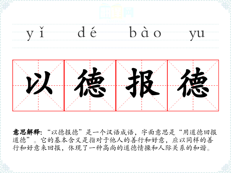 “以德报德”是一个汉语成语,字面意思是“用道德回报道德”。它的基本含义是指对于他人的善行和好意,应以同样的善行和好意来回报,体现了一种高尚的道德情操和人际关系的和谐。