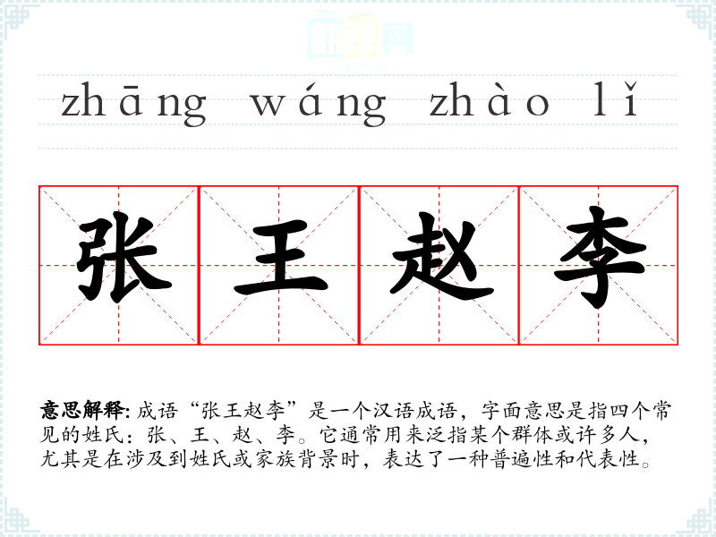 成语“张王赵李”是一个汉语成语,字面意思是指四个常见的姓氏:张、王、赵、李。它通常用来泛指某个群体或许多人,尤其是在涉及到姓氏或家族背景时,表达了一种普遍性和代表性。