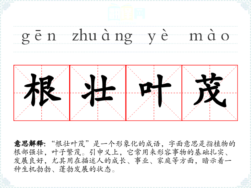 “根壮叶茂”是一个形象化的成语,字面意思是指植物的根部强壮,叶子繁茂。引申义上,它常用来形容事物的基础扎实、发展良好,尤其用在描述人的成长、事业、家庭等方面,暗示着一种生机勃勃、蓬勃发展的状态。