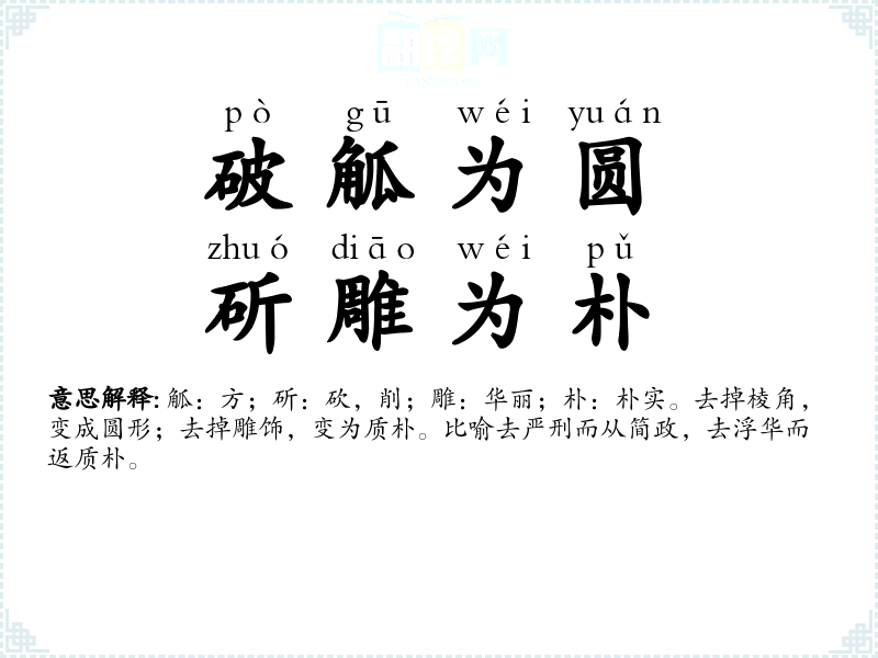 觚:方;斫:砍,削;雕:华丽;朴:朴实。去掉棱角,变成圆形;去掉雕饰,变为质朴。比喻去严刑而从简政,去浮华而返质朴。 |