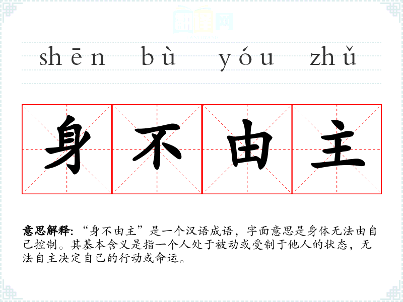 “身不由主”是一个汉语成语,字面意思是身体无法由自己控制。其基本含义是指一个人处于被动或受制于他人的状态,无法自主决定自己的行动或命运。