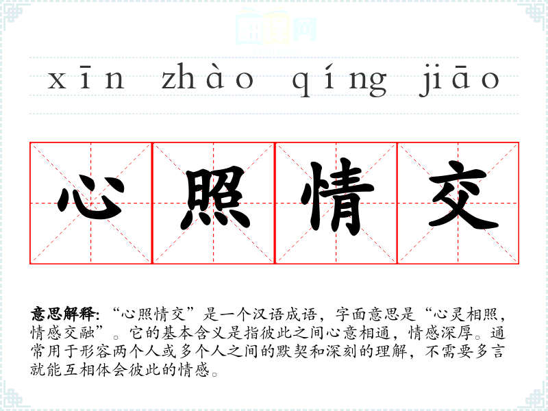 “心照情交”是一个汉语成语,字面意思是“心灵相照,情感交融”。它的基本含义是指彼此之间心意相通,情感深厚。通常用于形容两个人或多个人之间的默契和深刻的理解,不需要多言就能互相体会彼此的情感。