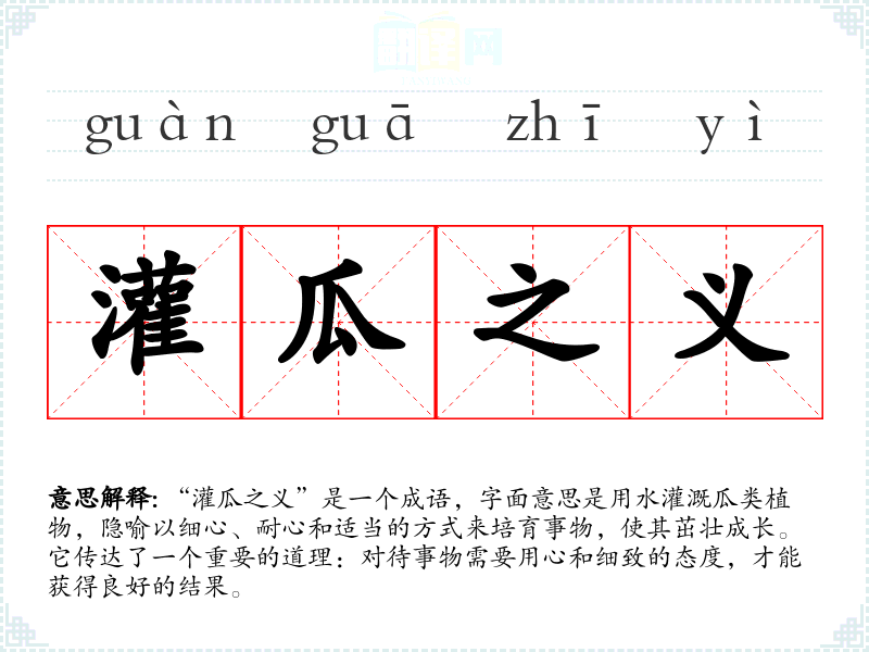 “灌瓜之义”是一个成语,字面意思是用水灌溉瓜类植物,隐喻以细心、耐心和适当的方式来培育事物,使其茁壮成长。它传达了一个重要的道理:对待事物需要用心和细致的态度,才能获得良好的结果。