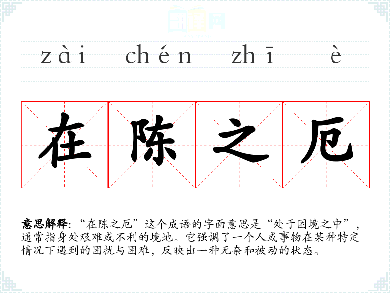 “在陈之厄”这个成语的字面意思是“处于困境之中”,通常指身处艰难或不利的境地。它强调了一个人或事物在某种特定情况下遇到的困扰与困难,反映出一种无奈和被动的状态。