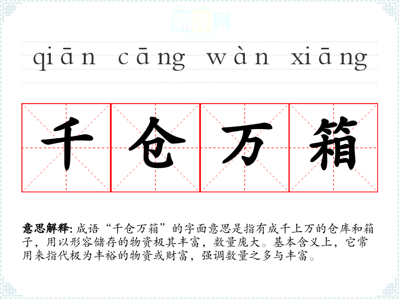 “千仓万箱”这一成语的具体历史来源并不明确,但它反映了古代社会对物资储备的重视。在古代,仓库和箱子是储存粮食、财物的重要措施,充足的物资储备往往与国家的强盛、家庭的富裕息息相关。这种成语可能源于古代的农耕文明,对丰收和富足的向往。