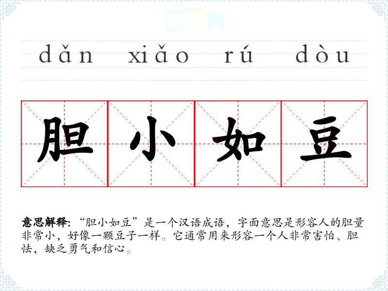 “胆小如豆”是一个汉语成语,字面意思是形容人的胆量非常小,好像一颗豆子一样。它通常用来形容一个人非常害怕、胆怯,缺乏勇气和信心。