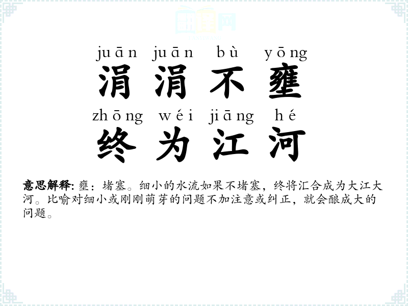 涓滴:小水珠。一点一滴的水珠汇集起来就可以成为河流。形容积少成多。 |