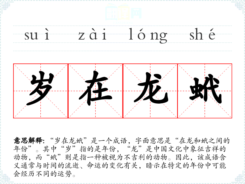 “岁在龙蚮”是一个成语,字面意思是“在龙和蚮之间的年份”。其中“岁”指的是年份,“龙”是**文化中象征吉祥的动物,而“蚮”则是指一种被视为不吉利的动物。因此,该成语含义通常与时间的流逝、命运的变化有关,暗示在特定的年份中可能会经历不同的运势。