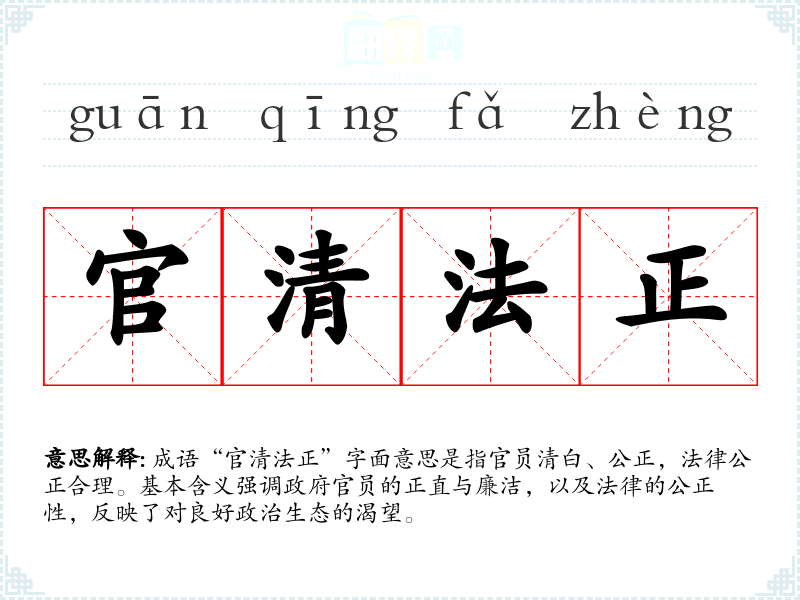 成语“官清法正”字面意思是指官员清白、公正,法律公正合理。基本含义强调政府官员的正直与廉洁,以及法律的公正性,反映了对良好政治生态的渴望。