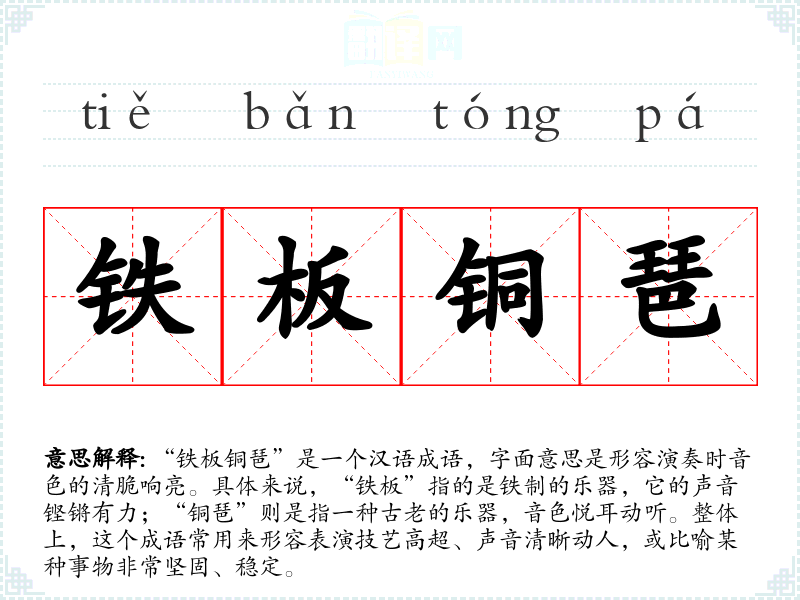 “铁板铜琶”是一个汉语成语,字面意思是形容演奏时音色的清脆响亮。具体来说,“铁板”指的是铁制的乐器,它的声音铿锵有力;“铜琶”则是指一种古老的乐器,音色悦耳动听。整体上,这个成语常用来形容表演技艺高超、声音清晰动人,或比喻某种事物非常坚固、稳定。