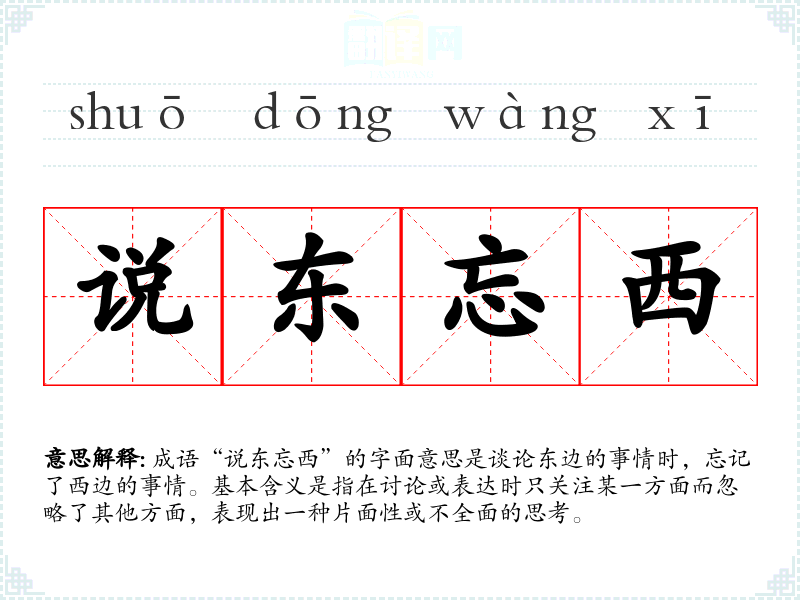 成语“说东忘西”的字面意思是谈论东边的事情时,忘记了西边的事情。基本含义是指在讨论或表达时只关注某一方面而忽略了其他方面,表现出一种片面性或不全面的思考。