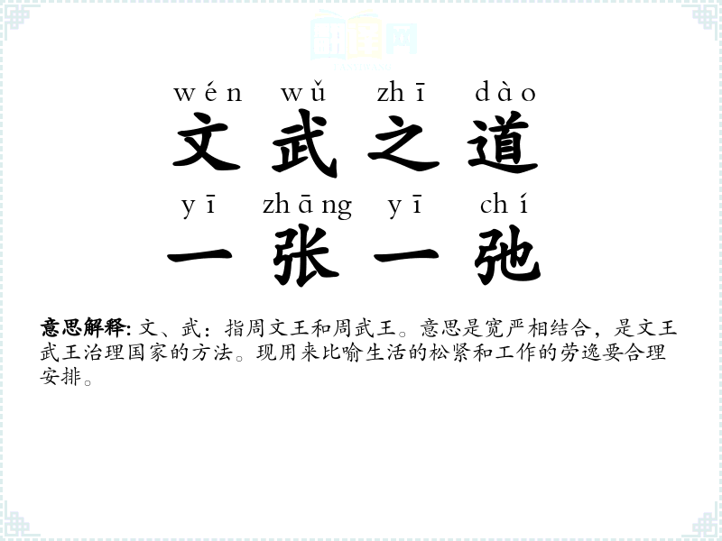 文、武:指周文王和周武王。意思是宽严相结合,是文王武王治理国家的方法。现用来比喻生活的松紧和工作的劳逸要合理安排。 |
