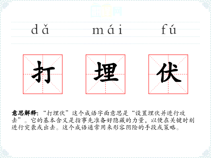 “打埋伏”这个成语字面意思是“设置埋伏并进行攻击”。它的基本含义是指事先准备好隐藏的力量,以便在关键时刻进行突袭或出击。这个成语通常用来形容阴险的手段或策略。