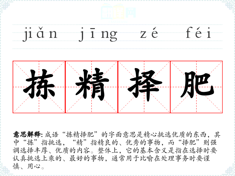 成语“拣精择肥”的字面意思是精心挑选优质的东西,其中“拣”指挑选,“精”指精良的、优秀的事物,而“择肥”则强调选择丰厚、优质的内容。整体上,它的基本含义是指在选择时要认真挑选上乘的、最好的事物,通常用于比喻在处理事务时要谨慎、用心。