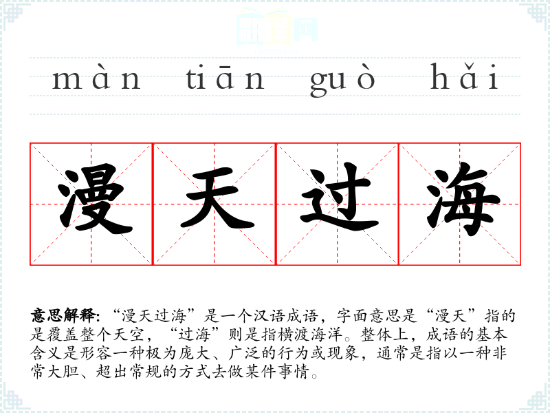 “漫天过海”是一个汉语成语,字面意思是“漫天”指的是覆盖整个天空,“过海”则是指横渡海洋。整体上,成语的基本含义是形容一种极为庞大、广泛的行为或现象,通常是指以一种非常大胆、超出常规的方式去做某件事情。