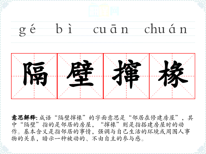 成语“隔壁撺椽”的字面意思是“邻居在修建房屋”,其中“隔壁”指的是邻居的房屋,“撺椽”则是指搭建房屋时的动作。基本含义是指邻居的事情,强调与自己生活的环境或周围人事物的关系,暗示一种被动的、不由自主的参与感。