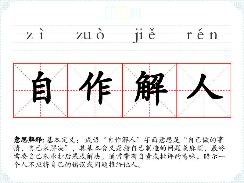 基本定义: 成语“自作解人”字面意思是“自己做的事情,自己来解决”,其基本含义是指自己制造的问题或麻烦,最终需要自己来承担后果或解决。通常带有自责或批评的意味,暗示一个人不应将自己的错误或问题推给他人。