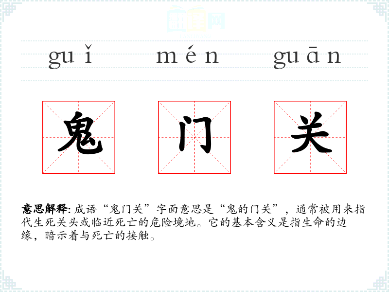 成语“鬼门关”字面意思是“鬼的门关”,通常被用来指代生死关头或临近死亡的危险境地。它的基本含义是指生命的边缘,暗示着与死亡的接触。