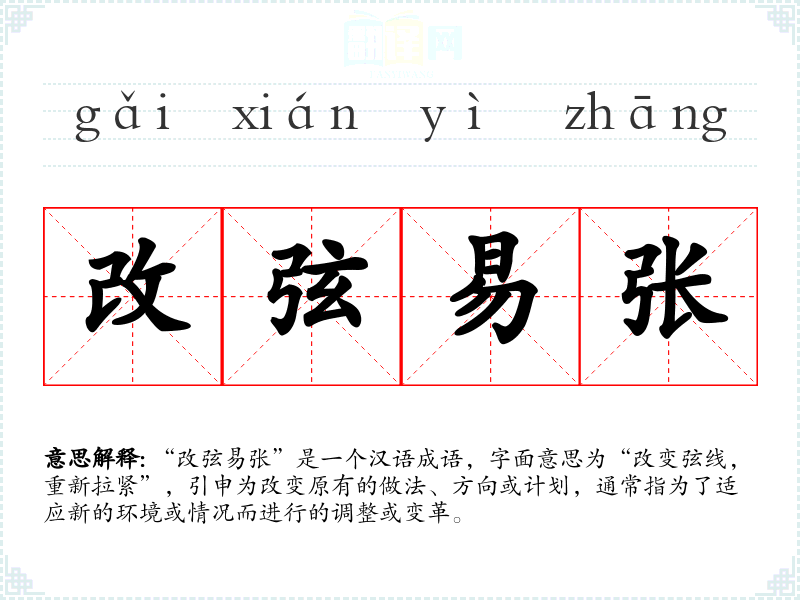 “改弦易张”是一个汉语成语,字面意思为“改变弦线,重新拉紧”,引申为改变原有的做法、方向或计划,通常指为了适应新的环境或情况而进行的调整或变革。