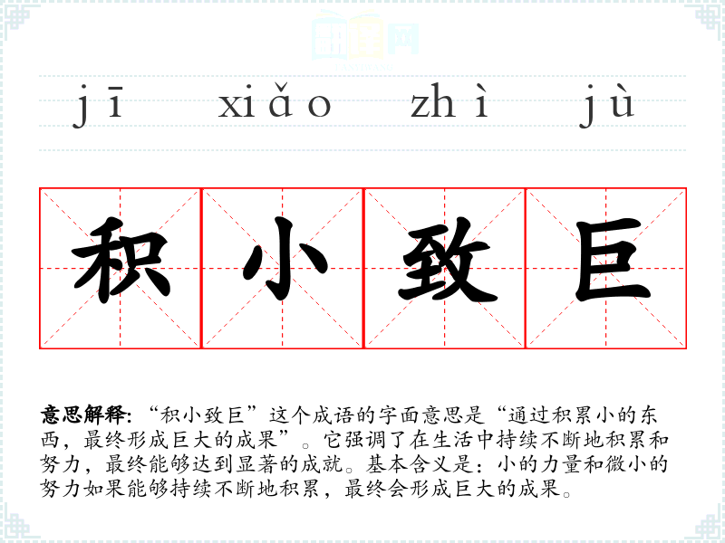“积小致巨”这个成语的字面意思是“通过积累小的东西,最终形成巨大的成果”。它强调了在生活中持续不断地积累和努力,最终能够达到显著的成就。基本含义是:小的力量和微小的努力如果能够持续不断地积累,最终会形成巨大的成果。