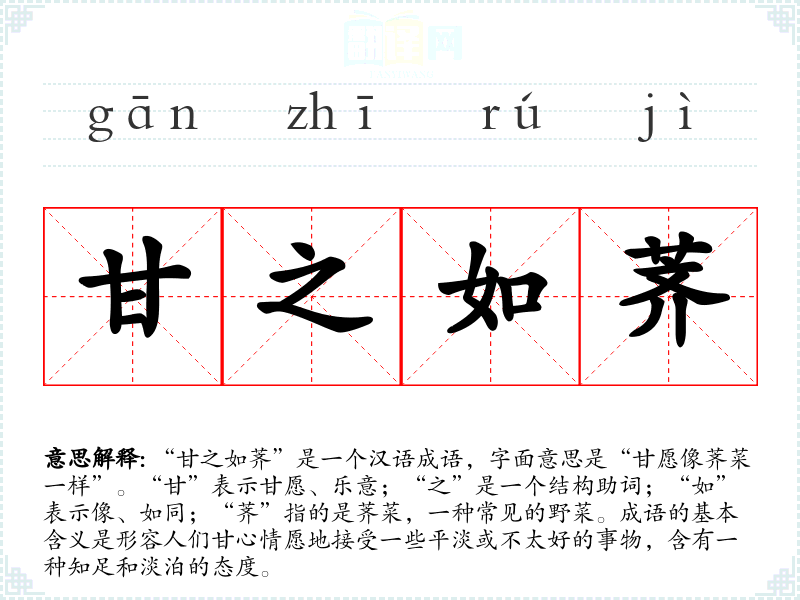 “甘之如荠”是一个汉语成语,字面意思是“甘愿像荠菜一样”。“甘”表示甘愿、乐意;“之”是一个结构助词;“如”表示像、如同;“荠”指的是荠菜,一种常见的野菜。成语的基本含义是形容人们甘心情愿地接受一些平淡或不太好的事物,含有一种知足和淡泊的态度。
