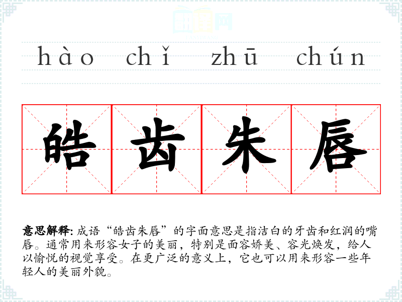 成语“皓齿朱唇”的字面意思是指洁白的牙齿和红润的嘴唇。通常用来形容女子的美丽,特别是面容娇美、容光焕发,给人以愉悦的视觉享受。在更广泛的意义上,它也可以用来形容一些年轻人的美丽外貌。