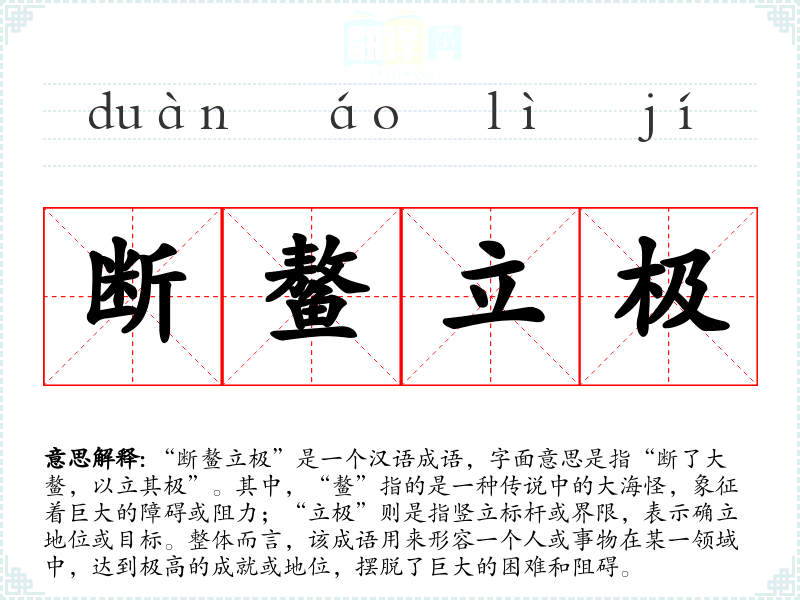 “断鳌立极”是一个汉语成语,字面意思是指“断了大鳌,以立其极”。其中,“鳌”指的是一种传说中的大海怪,象征着巨大的障碍或阻力;“立极”则是指竖立标杆或界限,表示确立地位或目标。整体而言,该成语用来形容一个人或事物在某一领域中,达到极高的成就或地位,摆脱了巨大的困难和阻碍。