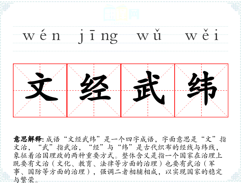 成语“文经武纬”是一个四字成语,字面意思是“文”指文治,“武”指武治,“经”与“纬”是古代织布的经线与纬线,象征着治国理政的两种重要方式。整体含义是指一个国家在治理上既要有文治(文化、教育、法律等方面的治理)也要有武治(军事、国防等方面的治理),强调二者相辅相成,以实现国家的稳定与繁荣。