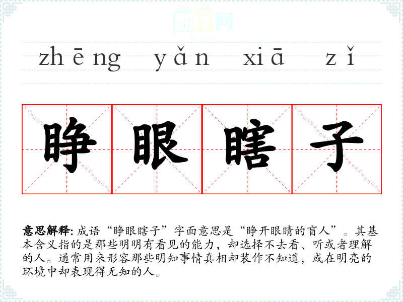 成语“睁眼瞎子”字面意思是“睁开眼睛的盲人”。其基本含义指的是那些明明有看见的能力,却选择不去看、听或者理解的人。通常用来形容那些明知事情真相却装作不知道,或在明亮的环境中却表现得无知的人。