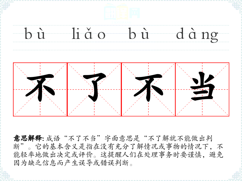 成语“不了不当”字面意思是“不了解就不能做出判断”。它的基本含义是指在没有充分了解情况或事物的情况下,不能轻率地做出决定或评价。这提醒人们在处理事务时要谨慎,避免因为缺乏信息而产生误导或错误判断。