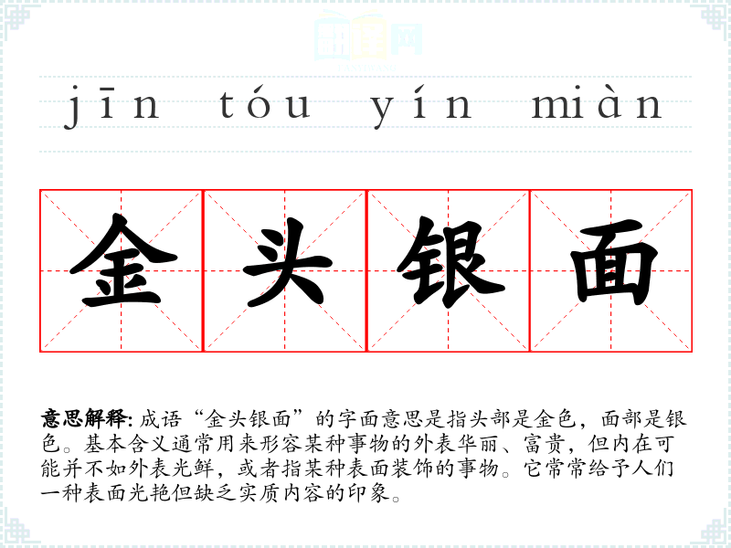 成语“金头银面”的字面意思是指头部是金色,面部是银色。基本含义通常用来形容某种事物的外表华丽、富贵,但内在可能并不如外表光鲜,或者指某种表面装饰的事物。它常常给予人们一种表面光艳但缺乏实质内容的印象。