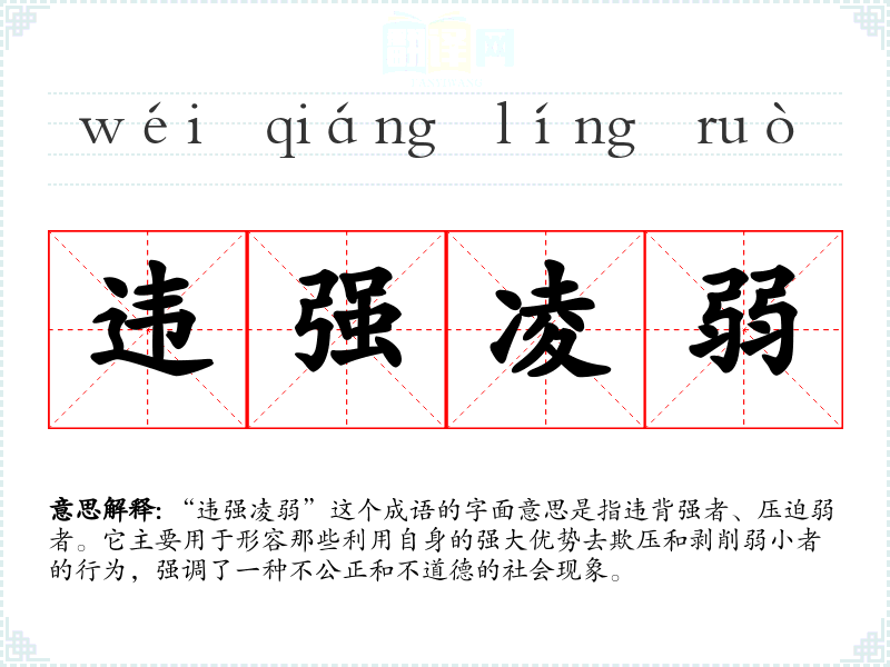 “违强凌弱”这个成语的字面意思是指违背强者、压迫弱者。它主要用于形容那些利用自身的强大优势去欺压和剥削弱小者的行为,强调了一种不公正和不道德的社会现象。