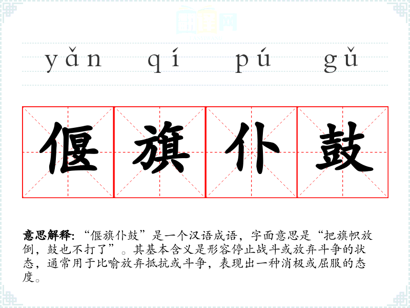 “偃旗仆鼓”是一个汉语成语,字面意思是“把旗帜放倒,鼓也不打了”。其基本含义是形容停止战斗或放弃斗争的状态,通常用于比喻放弃抵抗或斗争,表现出一种消极或屈服的态度。