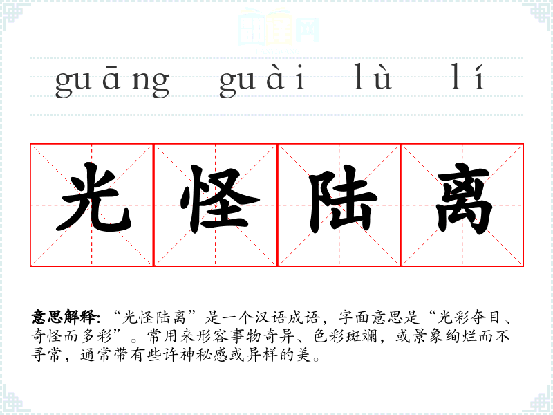 “光怪陆离”是一个汉语成语,字面意思是“光彩夺目、奇怪而多彩”。常用来形容事物奇异、色彩斑斓,或景象绚烂而不寻常,通常带有些许神秘感或异样的美。