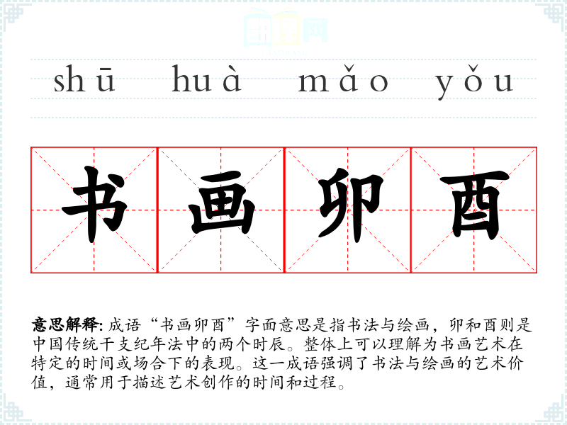 成语“书画卯酉”字面意思是指书法与绘画,卯和酉则是**传统干支纪年法中的两个时辰。整体上可以理解为书画艺术在特定的时间或场合下的表现。这一成语强调了书法与绘画的艺术价值,通常用于描述艺术创作的时间和过程。