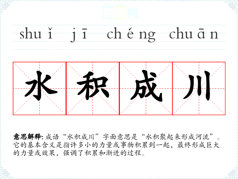 成语“水积成川”字面意思是“水积聚起来形成河流”。它的基本含义是指许多小的力量或事物积累到一起,最终形成巨大的力量或效果,强调了积累和渐进的过程。